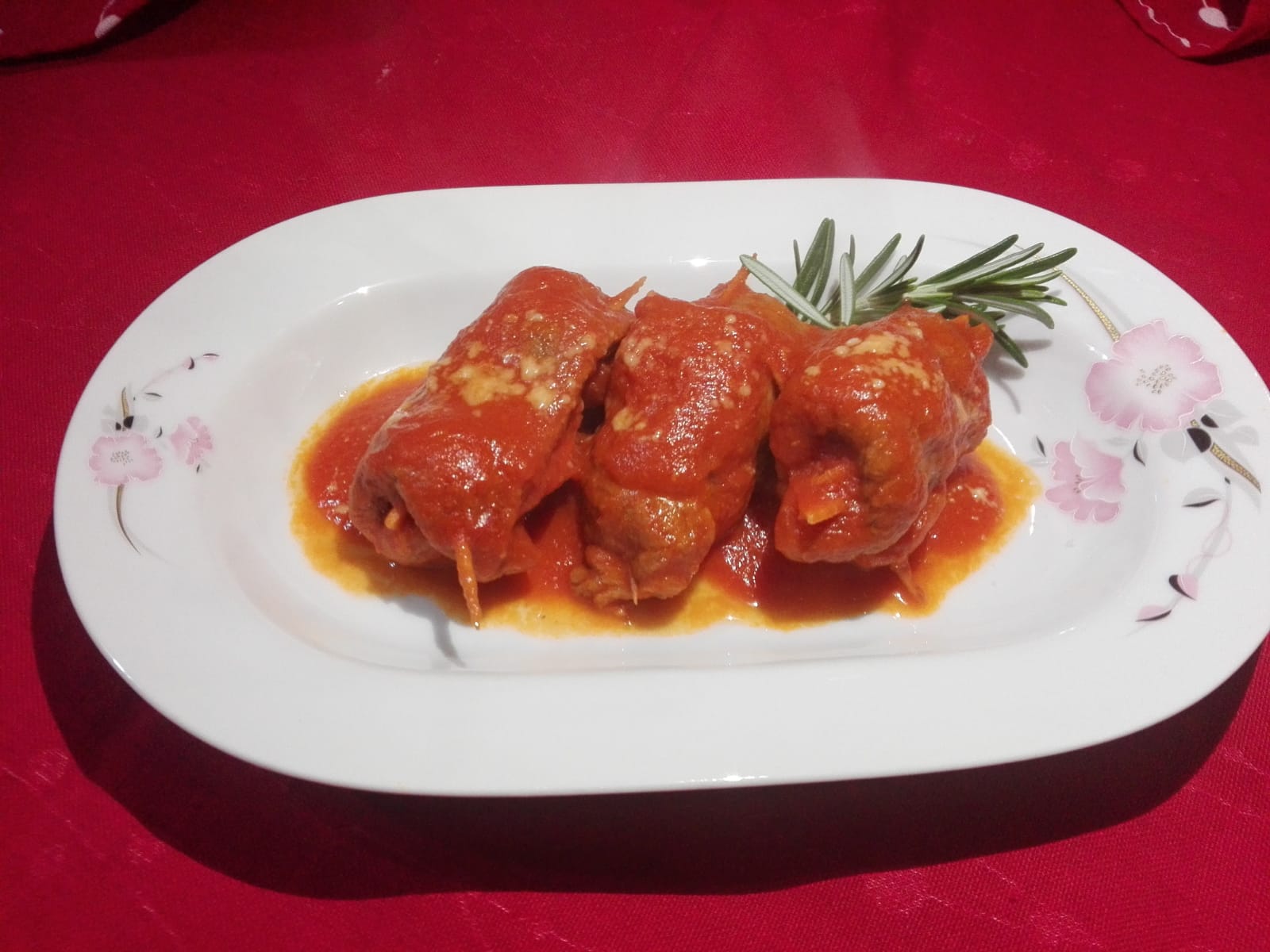 2. In una padella adatta, versate l'olio evo e la cipolla, rosolate e aggiungete gli involtini, facendoli rosolare da entrambi i lati. Poi aggiungete la passata, aggiustate di sale e foglioline di basilico. Coprite e lasciate cuocere a fuoco lento per 1 ora e mezza, rigirando di tanto in tanto, durante la cottura. Con questo sugo, si può condire un primo piatto.