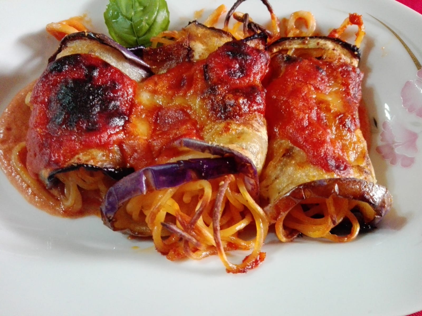 4. Portate gli spaghetti a cottura. Scolateli e insaporiteli con un pò di sugo. Con una forchetta adagiateli su una fettina di melanzana, aggiungete un pezzo di mozzarella, richiudeteli su se stessi, facendo attenzione a non fargli aprire.